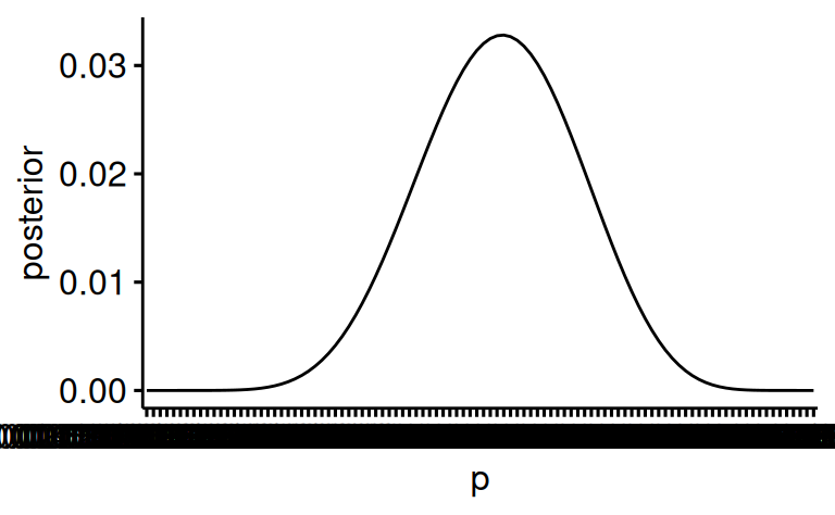 d <- tibble(p = p_grid, posterior = posterior)rethink3m1