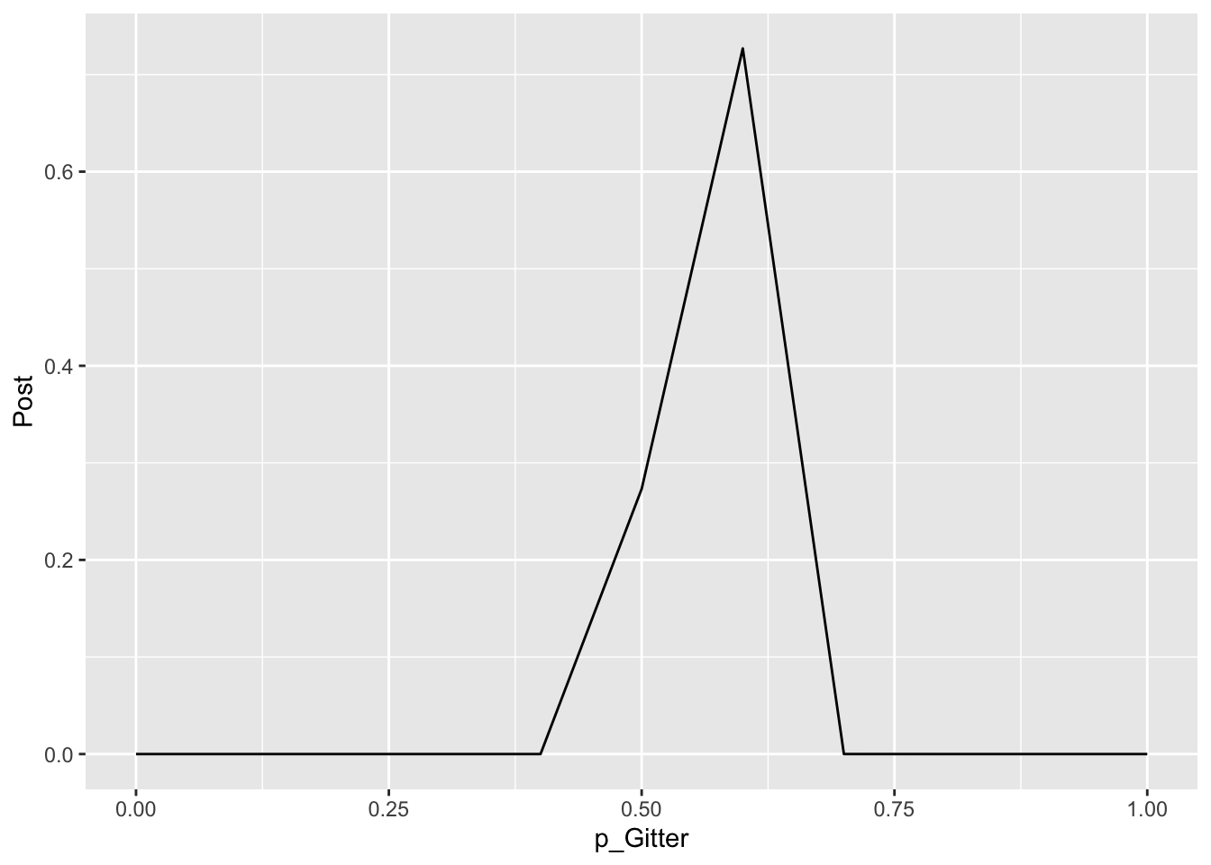 Likelihood = dbinom(140, size = 250, prob = p_Gitter),