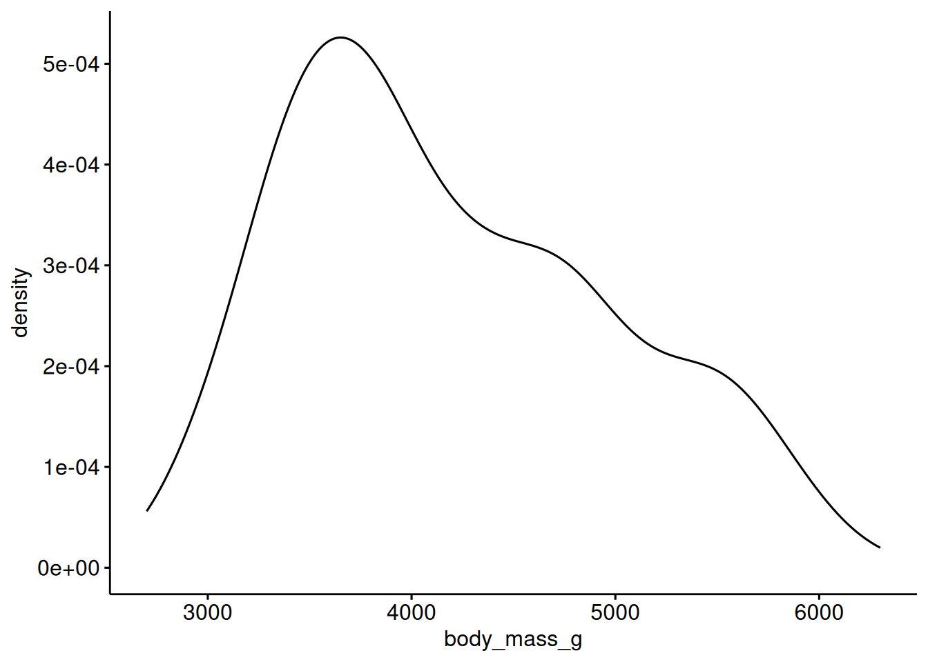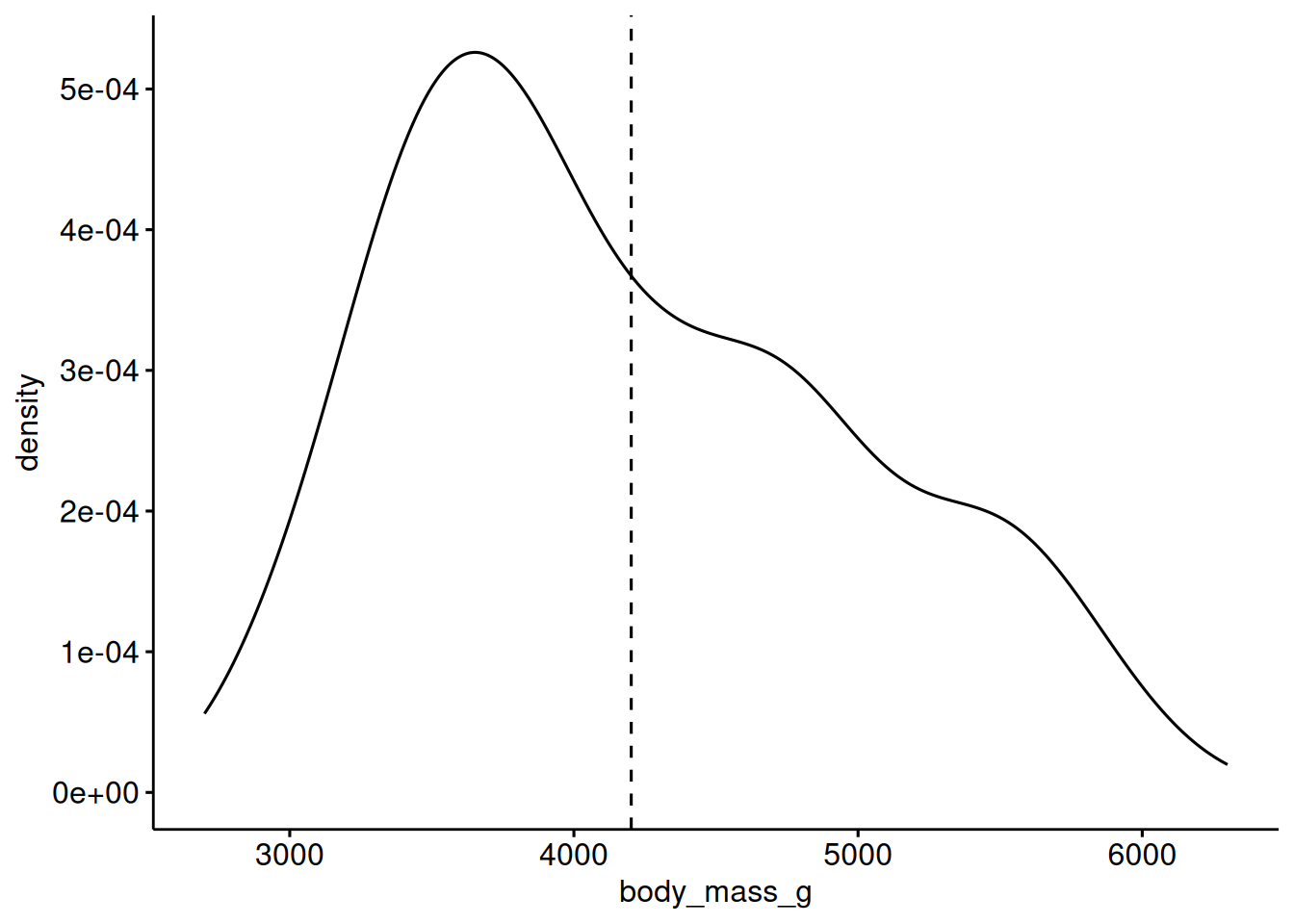 ggdensity(penguins, x = "body_mass_g", add = "mean")